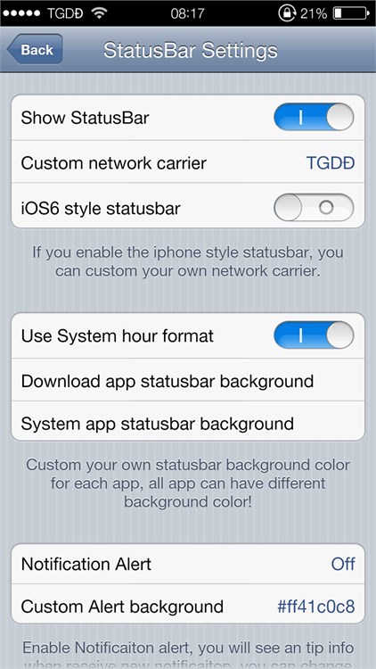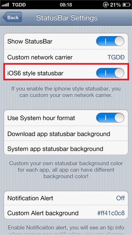 2. Style Statusbar: bạn có thể tuỳ chọn thay đổi statusbar theo phong cách iOS 6 hoặc iOS 7.